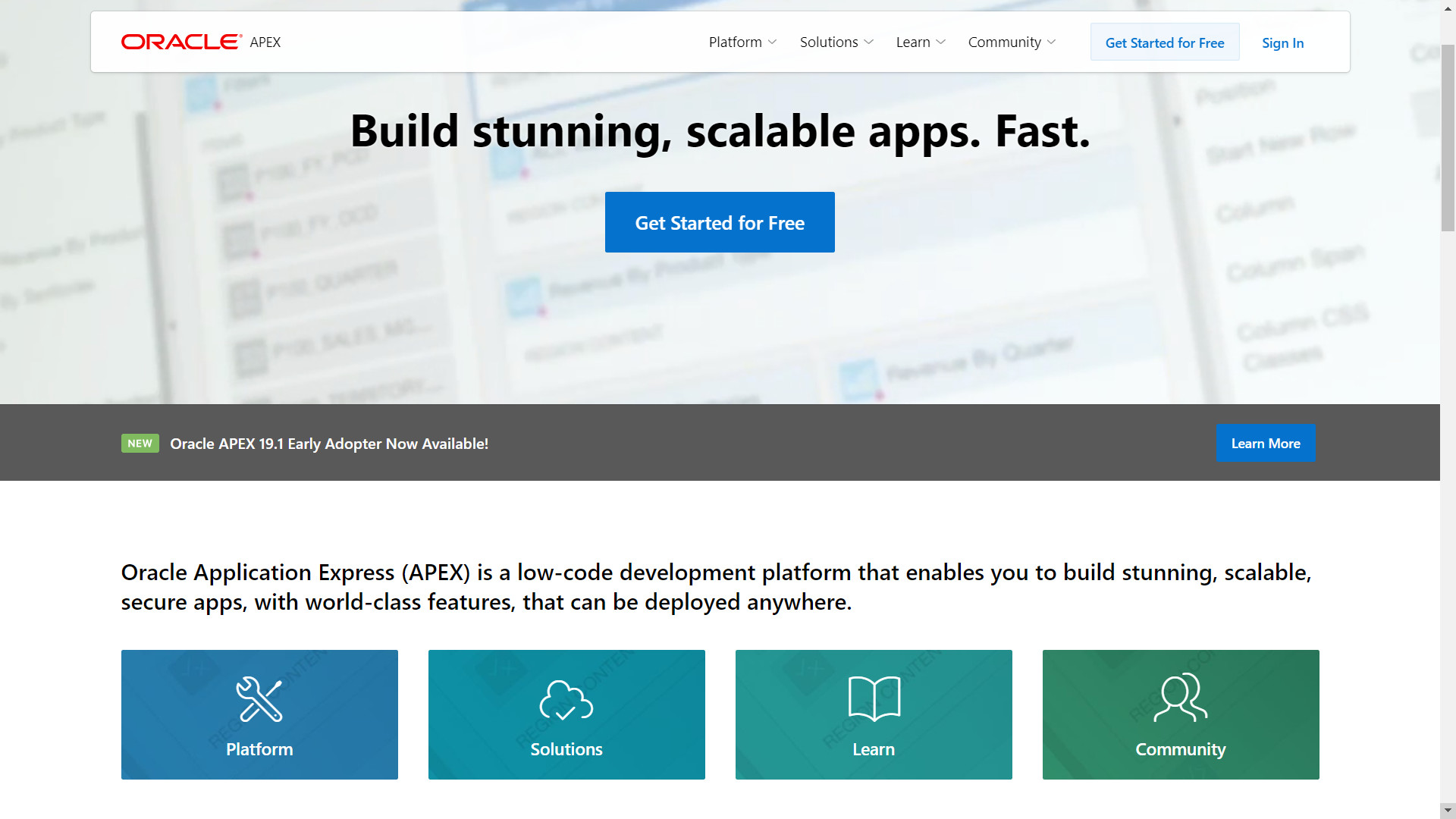 Oracle Application Express的缩写,是集成在数据库内部的快速,低代码Web应用开发平台,APEX的开发也是基于Web的。之前介绍的Ask TOM,Database Features,Oracle Learning Library都是基于APEX开发的。如果您希望使用APEX开发应用,那么此网站就是您的不二之选。
