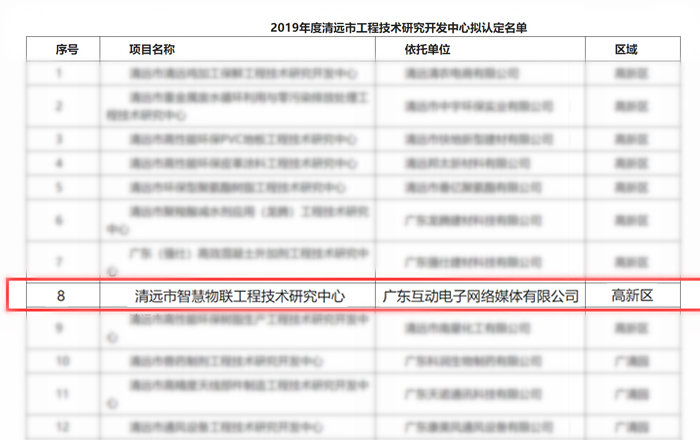 近日从,清远市科技局正式公布“关于2019年度拟认定清远市工程技术研究开发中心名单”中悉知,我司申报的清远市智慧物联工程技术研究中心通过正式认定!