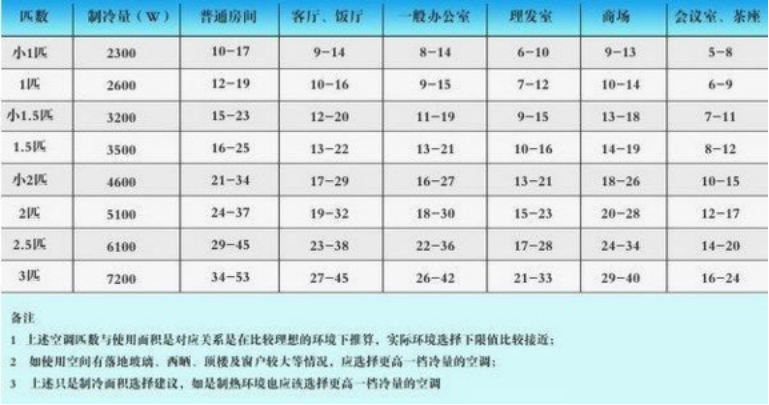 对于1匹空调具体是什么概念,其实很多专业人士也不一定说得清楚。网络上比较流行的说法有以下两种。说法一:1匹= 2324 W制冷量认为1匹的制冷量大致为2000大卡(又是一个有代沟的名词),以国际单位换算应乘以1.162,故一匹制冷量为2000×1.162=2324W。说法二:1匹 = 2500W制冷量据说这是从日本人那沿袭来的(日本空调在中国影响力比较大),根据能效比EER计算得来。一匹的定义就是输入1马力(735 W)的功率所能产生的制冷量大小,这里面就有一个系数问题,日本人规定这个系数为3.4(日本人认为空调最小能效比EER应达到3.4),所以1匹=735×3.4=2499W。