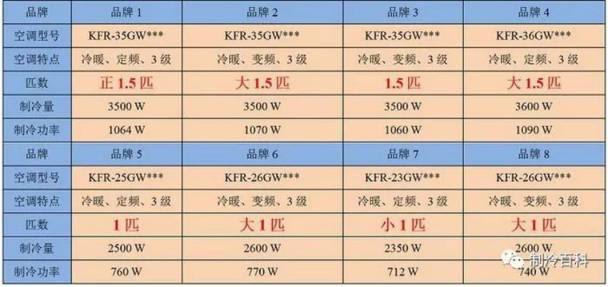 以上两种说法都有一定道理,而且结果相近,难以判断真伪。下表是市面上国内不同品牌空调的性能参数。