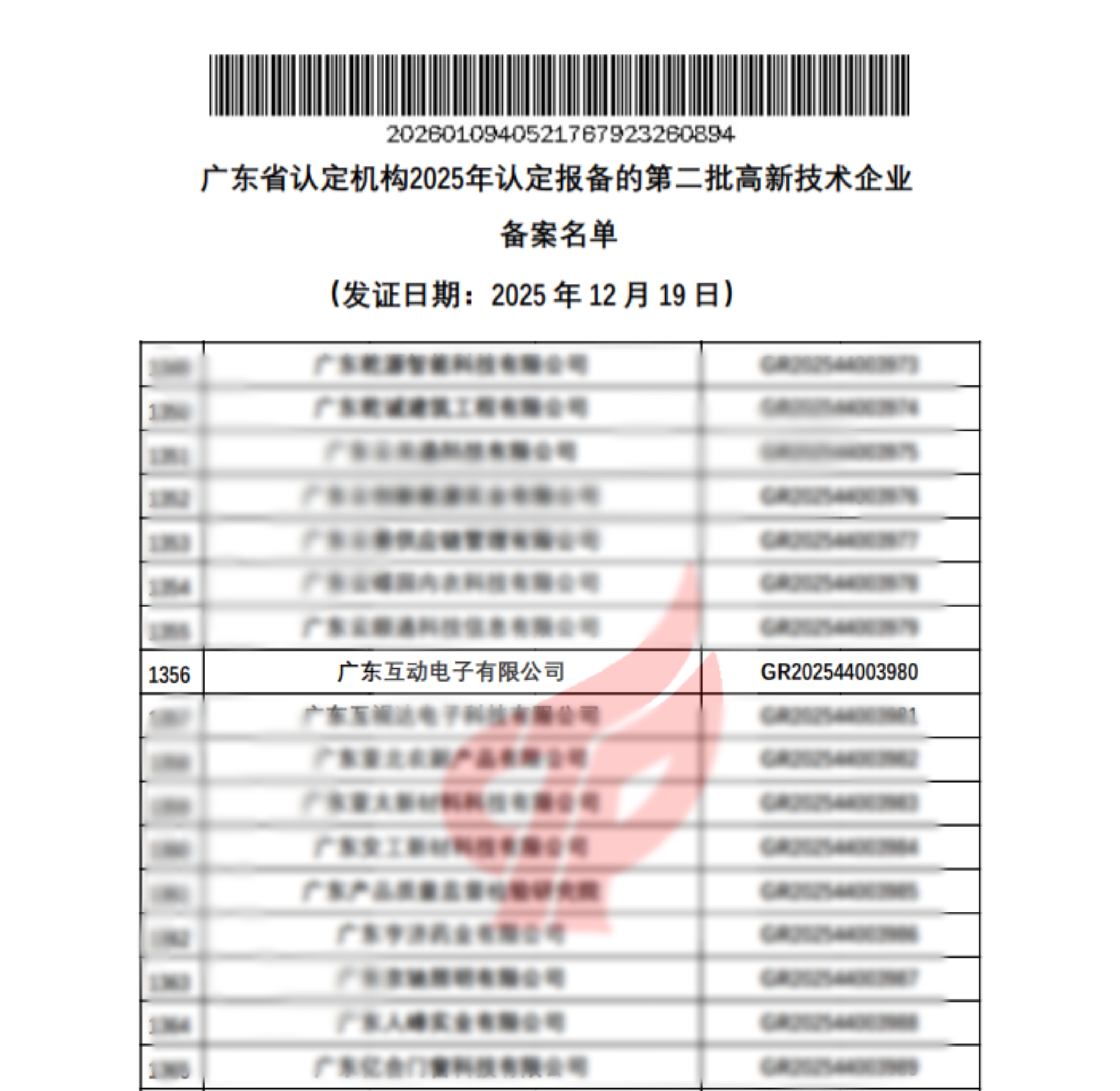 近日,广东互动电子有限公司收到由广东省科学技术厅、广东省财政厅、国家税务总局广东省税务局联合颁发的《高新技术企业证书》。这是公司连续第三次通过国家级高新技术企业认定,充分彰显了企业在自主创新、技术研发与核心竞争力方面的持续稳固实力。