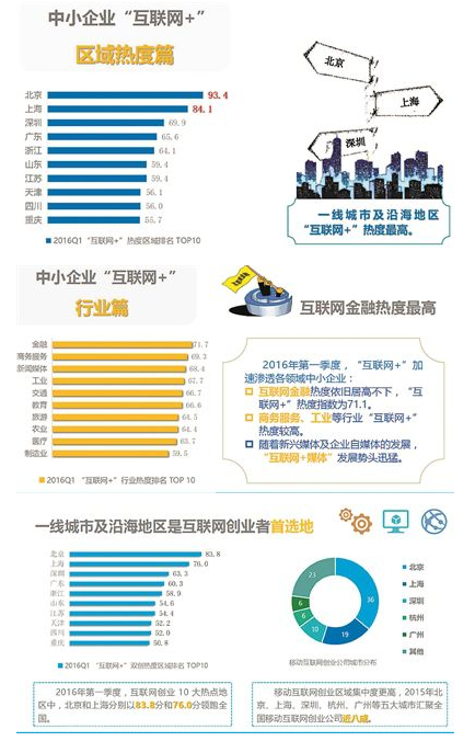 近日,工业和信息化部电子科学技术情报所、猪八戒网和人民网联合发布了2016年第一季度《中小企业“互联网+”指数报告》。