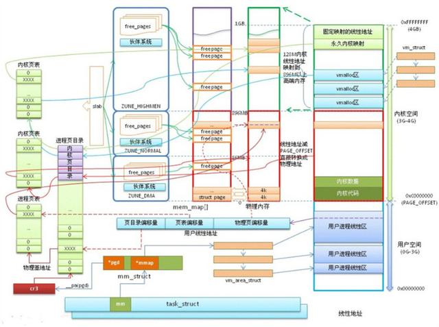 从上图可以看出,虚拟地址(线性地址)分为用户空间和内核空间,其中内核空间又分为四个区:直接映射区、vmalloc区、永久内核映射区、固定映射区。这四个区的虚拟地址映射到物理地址的方式不同,所以将内核空间分为了四个区。