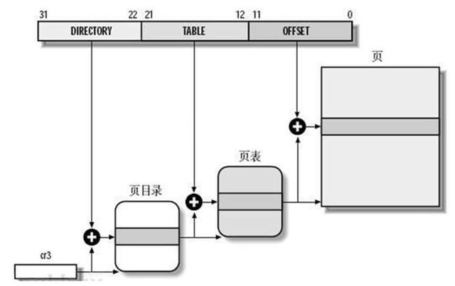 得到一个虚拟地址后,将该地址分为DIRECTORY,TABLE,OFFSET三段。首先根据cr3得到页目录的基地址,该基地址加上DIRECTORY后,可以从页目录中找到页表的基地址;页表基地址加上TABLE,可以从页表中找到页的基地址;页的基地址加上偏移量OFFSET可以找到对应的物理地址。