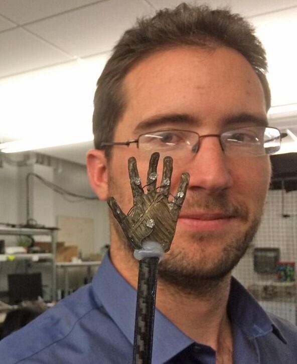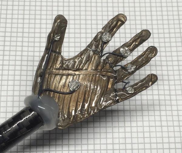 犹他大学的博士研究生James Carrico展示一个小小的3D打印离子聚合物—金属复合软机器人手